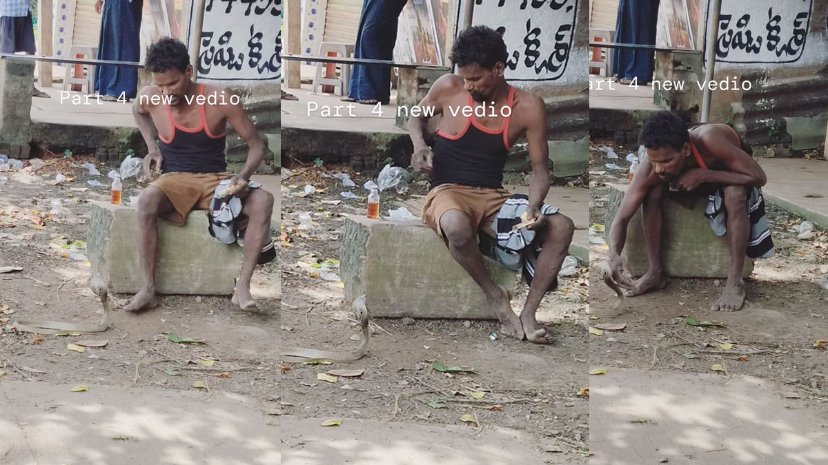 इंटरनेट पर एक वीडियो वायरल हो रहा है, जिसमें एक शख्स देसी पव्वा की बोतल के साथ बैठा हुआ है. दारु पीने के बाद उसके ऊपर नशा ऐसा चढ़ता है कि वह बगल में बैठे कोबरा से खेलना शुरू कर देता है. वह उसके फन को सहलाने लगता है. नशेड़ी इंसान उस कोबरा को ऐसे प्यार करता है, जैसे मानो वह उसका कोई पालतू जानवर हो.
